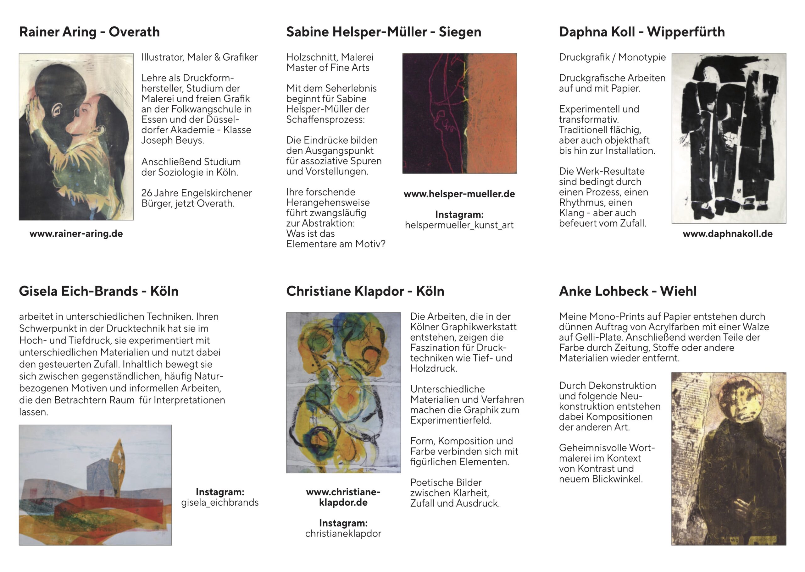 Gemeinschafts- und Doppelausstellungen: 1994 – 2026 über 20 u.a. Bergisch Gladbach, Juist, Köln, Kürten.
